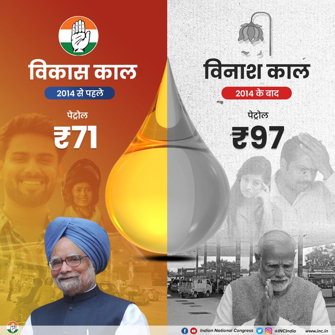 कांग्रेस ने अपने एक और ट्वीट से यूपीए और एनडीए शासन के दौरान पेट्रोल कीमतों की तुलना की है। कांग्रेस ने अपने काल को 2014 से पहले विकास काल तो मोदी सरकार के कार्यकाल को विनाश काल नाम दिया है। 2014 से पहले यूपीए के शासन में पेट्रोल 71 रुपये और मोदी सरकार के दौरान पेट्रोल 97 रुपये पहुंच गया।