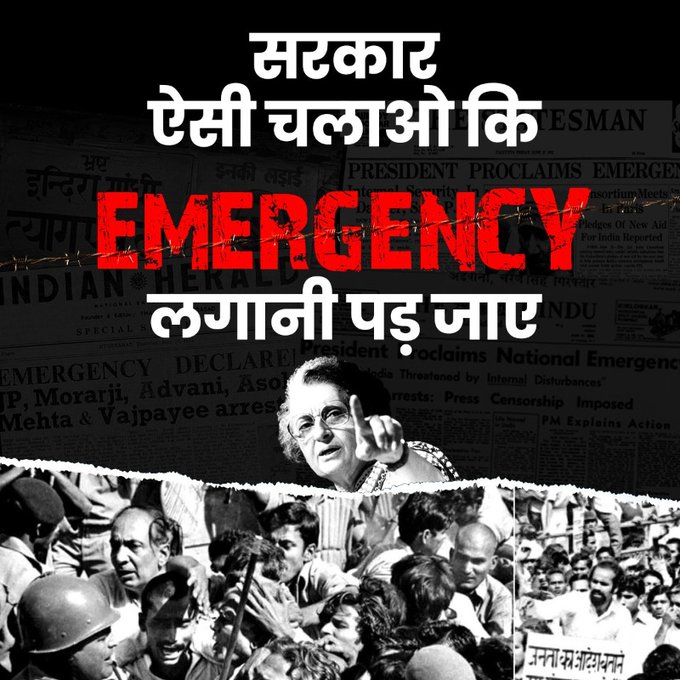 भारतीय जनता पार्टी ने अपने आधिकारिक ट्विटर हैंडल से इससे पहले 1975 में लगाई गई इमरजेंसी को लेकर भी तंज कसा। तत्कालीन प्रधानमंत्री इंदिरा गांधी की फोटो के साथ भाजपा ने लिखा कि सरकार ऐसी चलाओ कि इमरजेंसी लगानी पड़ जाए। बीजेपी ने इस तंज से लोगों को उस काले दिन की याद दिलाने की कोशिश की है। भाजपा का मैसेज साफ है कि अगर कांग्रेस दोबारा सत्ता में आएगी तो इमरजेंसी जैसी स्थिति फिर आ सकती है।
