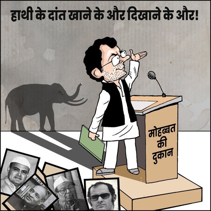 भारतीय जनता पार्टी ने कांग्रेस नेता राहुल गांधी के अमेरिका में दिए बयान और मोहब्बत की दुकान वाले स्टेटमेंट पर तीखा हमला बोला है। राहुल गांधी के कार्टून की मदद से भाजपा ने लिखा कि हाथी के दांत खाने के और दिखाने के और। इस फोटो में फिरोज गांधी, संजय गांधी, पीवी नरसिम्हा राव की तस्वीरें भी लगाई हैं। बीजेपी ने लिखा कि अपने नेताओं का अपमान करने वाले, आज चला रहे 'कथित' मोहब्बत की दुकान। इन नेताओं की तस्वीर लगाकर बीजेपी यह बताना चाहती है कि फिरोज गांधी, संजय गांधी, पीवी नरसिम्हा राव को कांग्रेस ने भुला दिया।