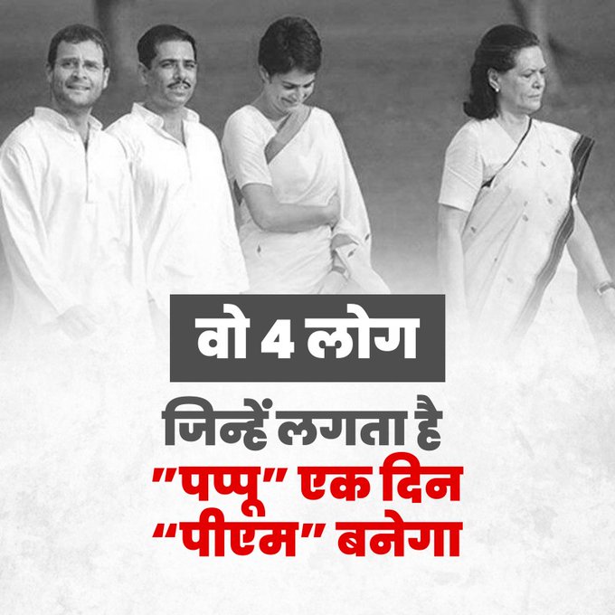 भारतीय जनता पार्टी ने आज कांग्रेस पर तंज कसते हुए एक ट्वीट किया। ट्वीट में तस्वीर लगाकर लिखा गया वो 4 लोग। इस तस्वीर में कांग्रेस की पूर्व अध्यक्ष सोनिया गांधी, पार्टी महासचिव प्रियंका गांधी, उनके पति रॉबर्ट वाड्रा और खुद राहुल गांधी। भाजपा ने तंज कसते हुए यह कहन चाह रही है कि सिर्फ गांधी परिवार को लगता है कि राहुल गांधी पीएम बन सकते हैं। इसमें उन्होंने राहुल को पप्पू कहकर संबोधित किया है। इस ट्वीट में उन्होंने 4 स्लाइड लगाई हैं। पहली स्लाइड में लिखा कि वो 4 लोग जिन्हें लगता है 'पप्पू एक दिन पीएम बनेगा'। दूसरी स्लाइड में लिखा है कि वो 4 लोग जिन्हें लगता है कि शासन उनका जन्मसिद्ध अधिकार है। तीसरी स्लाइड में लिखा है कि वो 4 लोग जिन्हें लगता है कि गरीबी सिर्फ एक मानसिकता है। चौथी स्लाइड में लिखा कि वो 4 लोग जिन्हें लगता है कि देश में बड़ा उनका दरबार है। पांचवी स्लाइड में लिखा कि वो 4 लोग जिन्हें लगता है लूटो और लूटने दो, बांटो और राज करो।