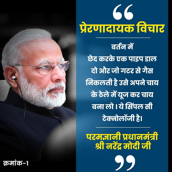 प्रधानमंत्री नरेंद्र मोदी ने अपने एक संबोधन में कहा था कि अगर गटर की गैस को ठेले वाला चााय बनाने में उपयोग करेगा तो उसे काफी मदद मिलेगी। इस बयान पर कांग्रेस समेत तमाम विपक्षी पार्टियों ने मजाक उड़ाया था। कांग्रेस ने इसी बयान को एक बार फिर याद दिलाकर पीएम पर ही तंज कस दिया है। कांग्रेस ने पीएम मोदी की फोटो लगाकर लिखा कि प्रेरणादायक विचार- बर्तन में छेद करके एक पाइप डाल दो और जो गटर से गैस निकलती है उसे अनपने चाय के ठेले में यूज कर चाय बना लो। ये सिंपल सी टेक्नोलॉजी है।