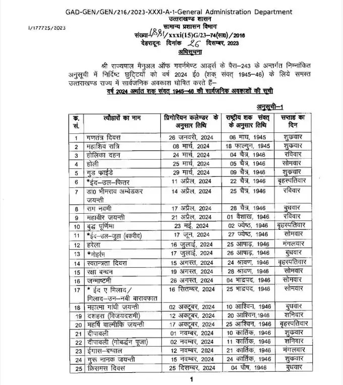 पुष्कर सिंह धामी सरकार की ओर से मंगलवार को अवकाश कैलेंडर जारी किया गया है। इस कैलेंडर में कुल 25 छुट्टियां दी गई हैं, जिसमें लोकपर्व ईगास के साथ अन्य छुट्टियों को शामिल किया गया है। इसका आदेश जारी कर दिया गया है।
