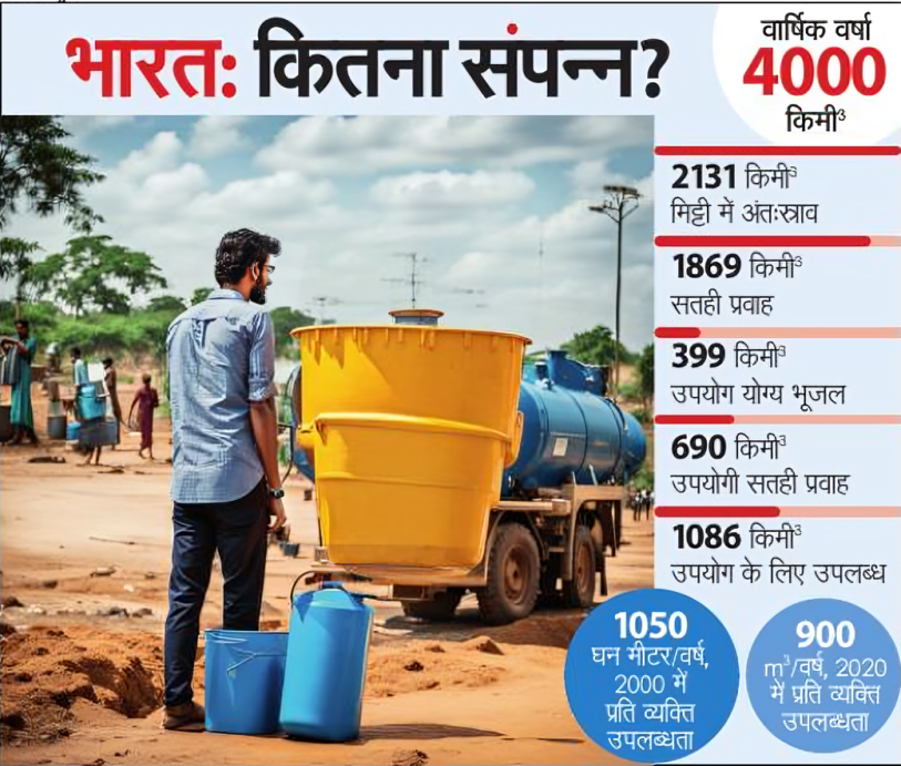 आबादी का दबाव : भारत में दुनिया की 18% आबादी रहती है, लेकिन जल संसाधन केवल 4% ही हैं। देश में औसत वर्षा 1100 मिमी होती है, जिसमें से तीन-चौथाई तीन महीने की छोटी अवधि में होती है। देश के विभिन्न भागों में बारिश में बड़ा अंतर है। राजस्थान और गुजरात के शुष्क क्षेत्रों में मात्र 150 मिमी बारिश होती है, जबकि पूर्वोत्तर में 2500 मिमी। प्रति व्यक्ति पानी की उपलब्धता 900 मीटर घन (m3)/वर्ष से भी कम है, जो घनी आबादी वाले गंगा के मैदानी इलाकों में 500 m3/वर्ष तक कम हो जाती है। यह उप-सहारा अफ्रीका के समान है, जहां लोग बूंद-बूंद पानी के लिए लड़ते हैं।