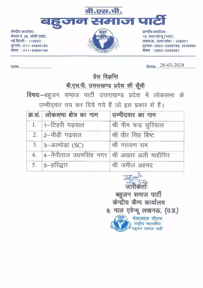 बहुजन समाज पार्टी ने टिहरी गढ़वाल लोकसभा सीट से नीम चंद्र छुरियाल को उम्मीदवार बनाया गया है। इसके साथ ही पौड़ी गढ़वाल सीट से धीर सिंह बिष्ट को प्रत्याशी घोषित किया गया है। जबकि अल्मोड़ा SC सीट से नरायण राम को कैंडिडेट घोषित किया है। वहीं नैनीताल उधमसिंह नगर लोकसभा सीट से बसपा के टिकट पर अख्तर अली माहीगिर चुनावी मैदान में ताल ठोकेंगे। इसके अलावा हरिद्वार सीट से बसपा ने जमील अहमद को प्रत्याशी बनाया है।