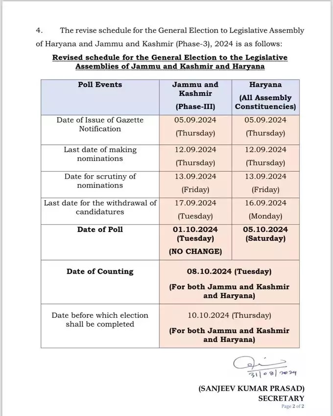 चुनाव आयोग ने बताया कि बिश्नोई समुदाय के सदियों पुराने त्योहार को ध्यान में रखते हुए हरियाणा विधानसभा चुनाव अब एक अक्टूबर के बजाय पांच अक्टूबर को होंगे। इसके अलावा जम्मू-कश्मीर और हरियाणा विधानसभा चुनावों की मतगणना अब चार अक्टूबर के बजाय आठ अक्टूबर को होगी।