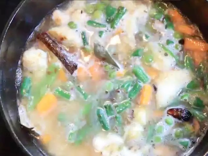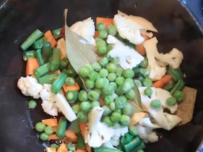 1 कप गोभी डालें कर पकाएं। अब इसमें 1 कप गाजर डालें, इसके बाद 1 कप बीन्स डालें। कुछ सैकेंड्स पकाएं और उसके बाद ¼ कप मटर डालें। आखिर में 2 लंबी कटी हुई हरी मिर्च डालें। सभी इंग्रिडियंट्स को 3-4 मिनट तक पकाएं।